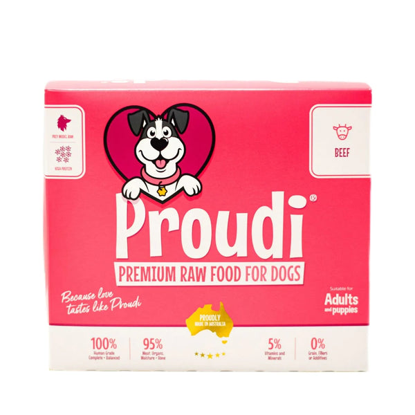 Proudi Beef Dog Patties Raw 2.4KG Proudi Beef recipe offers 100% human-grade ingredients: 95% beef meat, offal, moisture, powdered bone, and 5% essential vitamins and minerals. Free from artificial additives, grains,...