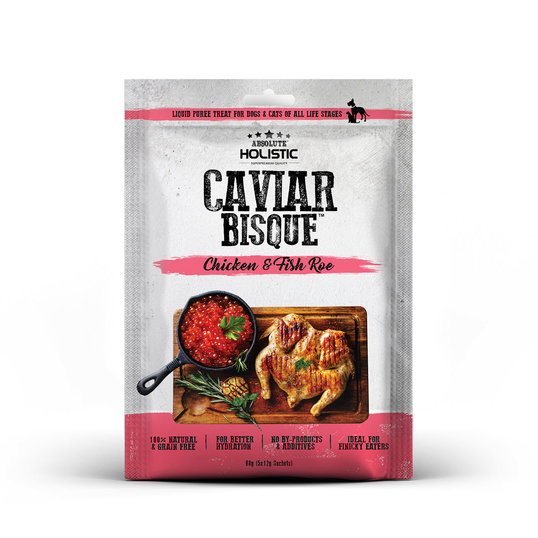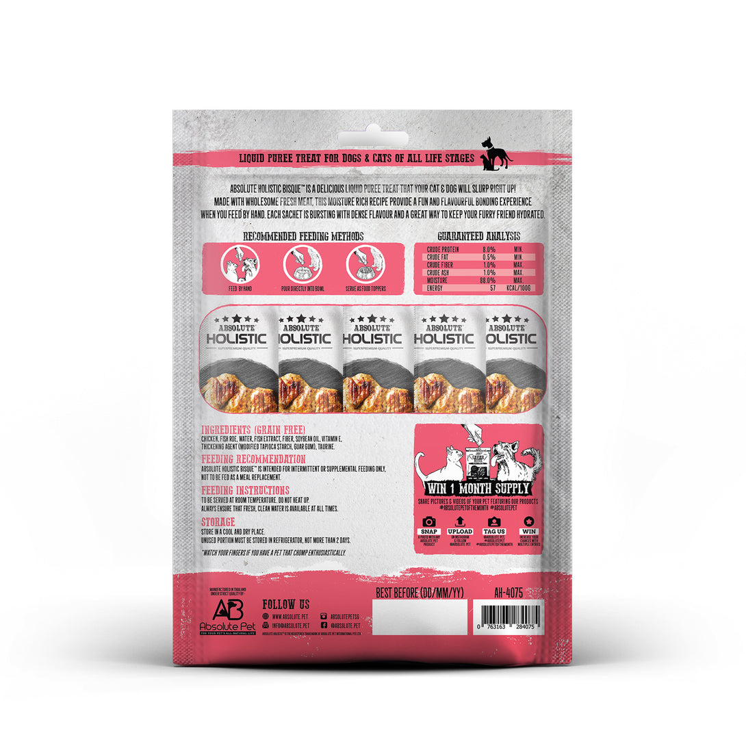 Absolute Holistic Bisque Chicken and Fish Roe recipe is a wholesome, premium liquid treat for cats & dogs. Made with fresh meat, it's a bonding delight when hand-fed. Optimal nutrition in a moisture-rich Chicken & Fish Roe recipe, a hit with picky pets. Caution: it's irresistible!