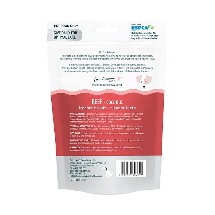 Bell & Bone is committed to providing natural, uncompromised, top-quality ingredients for a blend of clean pet food you can trust. Our dental sticks are specifically designed to support your dog’s overall oral health. Bell & Bone selects two active ingredients in our dental sticks that have been clinically proven by veterinarians. We use grain- and filler-free, Australian-made ingredients with real meat as the first ingredient to ensure your dogs are getting all the right nutrients.
