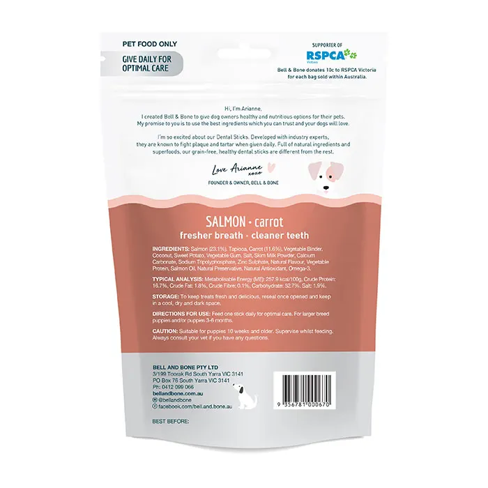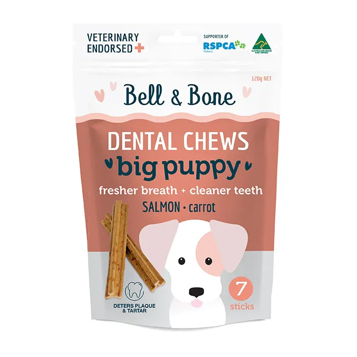 Bell & Bone's Salmon and Carrot Puppy Dental chews big is specially designed to support your puppy's overall dental health and reduce the risks of dental disease. This dental treat comes with a unque 3-pronged shape, and two active ingredients that reduce and prevent plaque and tartar build-up. Bell & Bone dental chews is made in Australian from wholesome ingredients and it is free from grains and fillers.