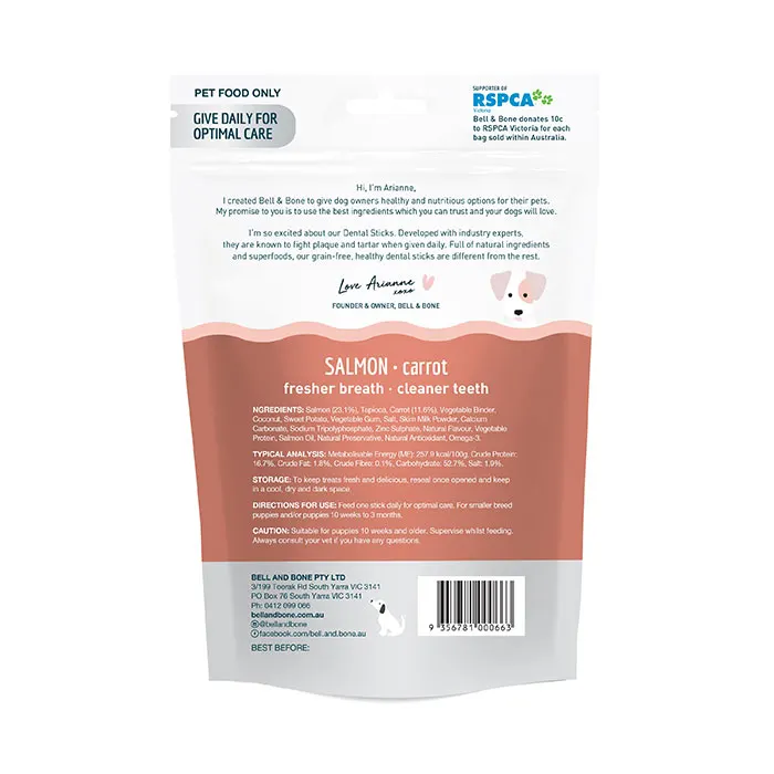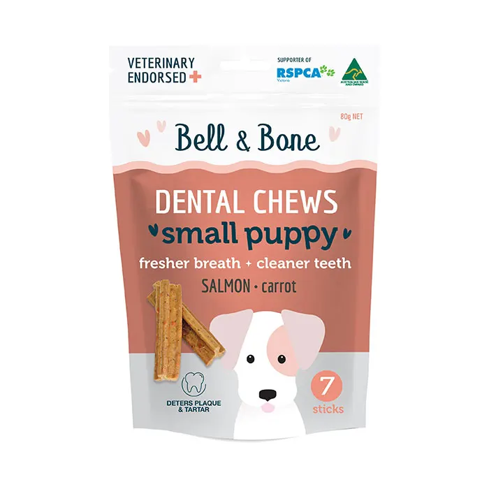Bell & Bone's Salmon and Carrot Puppy Dental chews big is specially designed to support your puppy's overall dental health and reduce the risks of dental disease. This dental treat comes with a unque 3-pronged shape, and two active ingredients that reduce and prevent plaque and tartar build-up. Bell & Bone dental chews is made in Australian from wholesome ingredients and it is free from grains and fillers.