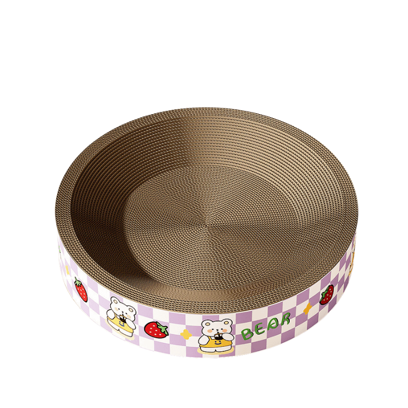 Its sturdy construction ensures long-lasting use, and the spacious, bowl-shaped design provides the perfect nest-like comfort for cats of all sizes. Each scratcher bed is adorned with playful and colorful designs, including themes like strawberry bear, avocado bunny, or a vibrant treasure bowl motif, making it as stylish as it is functional.