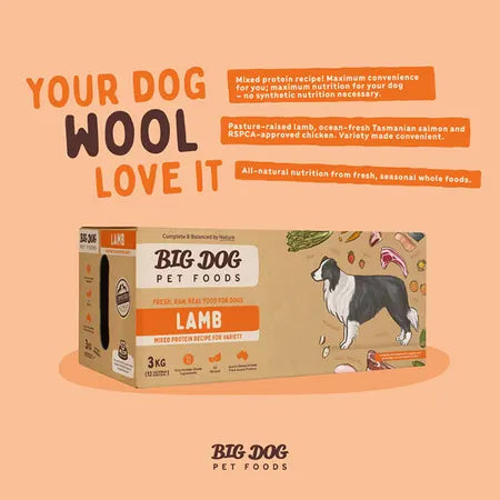 Big Dog BARF Lamb Raw Dog Food 3KG is a nutrient-dense, biologically appropriate natural raw dog food made from fresh Australian lamb and whole foods. This protein-rich raw lamb dog food features lamb muscle meat, organs, bone, and cartilage blended with chicken, Tasmanian salmon, fruits, vegetables, and functional superfoods to nourish your dog from the inside out.