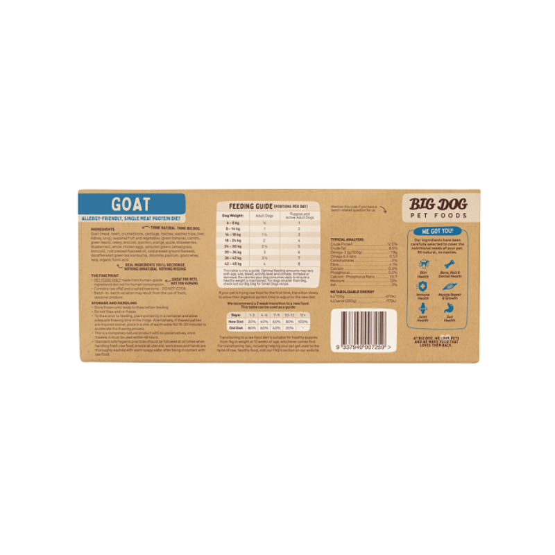 As part of the Big Dog Raw Pet Food range, this goat recipe is completely grain free and free from fillers or artificial additives — ideal for elimination diets or sensitive digestive systems. Each 3KG pack includes 12 × 250g patties for convenient portion control and safe raw feeding.