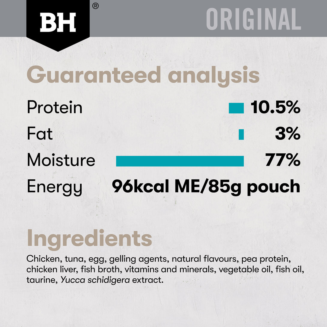 Chicken, tuna, egg, gelling agents, natural flavours, pea protein, chicken liver, fish broth, vitamins & minerals, vegetable oil, fish oil, taurine, Yucca schidigera extract.