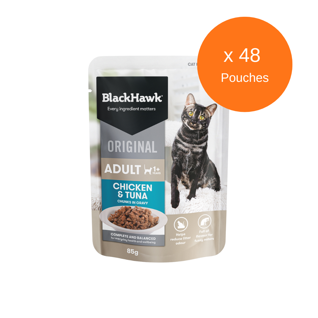 Discover the perfect pairing with Black Hawk Chicken & Tuna Gravy Adult Wet Cat Food. Crafted with real chicken and tuna, this recipe delivers high-quality protein to support lean muscle, brain function, and overall vitality. The rich gravy adds essential hydration, helping to maintain urinary health and smooth digestion, while Yucca extract helps reduce litter odour.