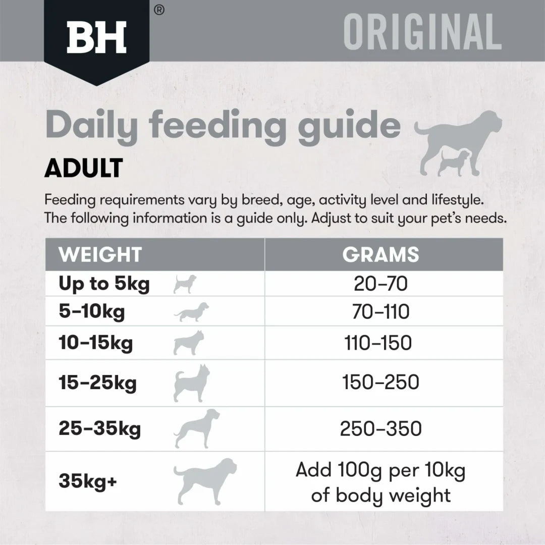 Feeding quantities may vary by breed, age, activity level, and climate. The following is a general guide only. Adjust amounts to suit your dog's needs.