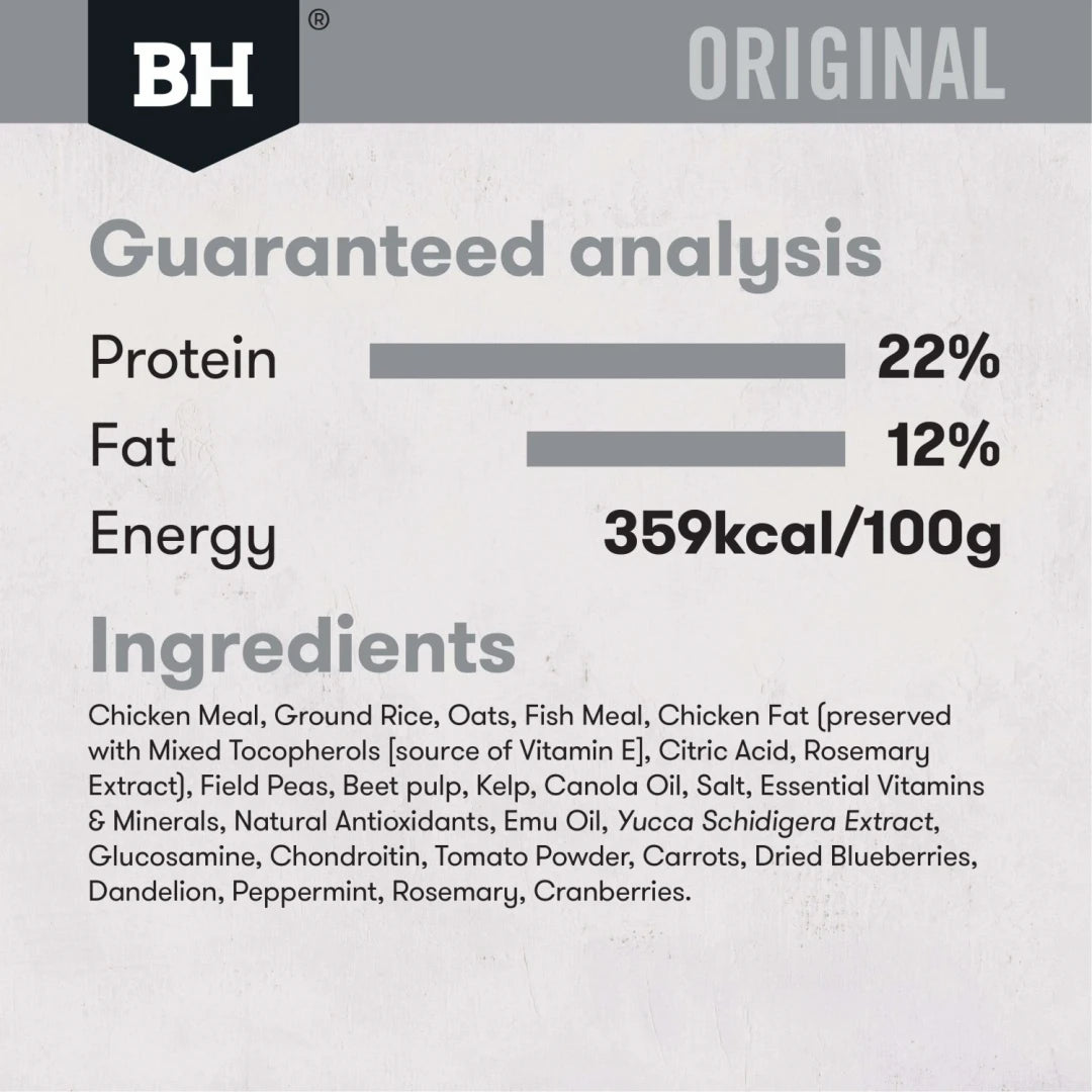 Chicken Meal, Rice, Oats, Field Peas, Chicken Fat (preserved with Mixed Tocopherols [source of Vitamin E], Citric Acid, Rosemary Extract), Beet Pulp, Chicken Digest, Fish Meal, Canola Oil, Essential Vitamins & Minerals (see tables), Kelp Meal, Chicory Root, Salt, Brewer's Yeast, Natural Antioxidants, Emu Oil, Yucca Schidigera Extract, Glucosamine, Chondroitin, Tomato Powder, Carrots, Dried Blueberries, Dandelion, Peppermint, Rosemary, Cranberries.