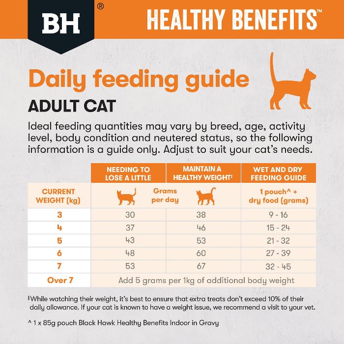 Black Hawk Healthy Benefits Chicken Weight Adult Dry Cat Food is specially designed for weight management in adult cats. This reduced calorie formula provides 11% fewer calories than the Original Chicken recipe, while still delivering complete and balanced nutrition. Perfect for indoor, neutered, or less active cats prone to weight gain.