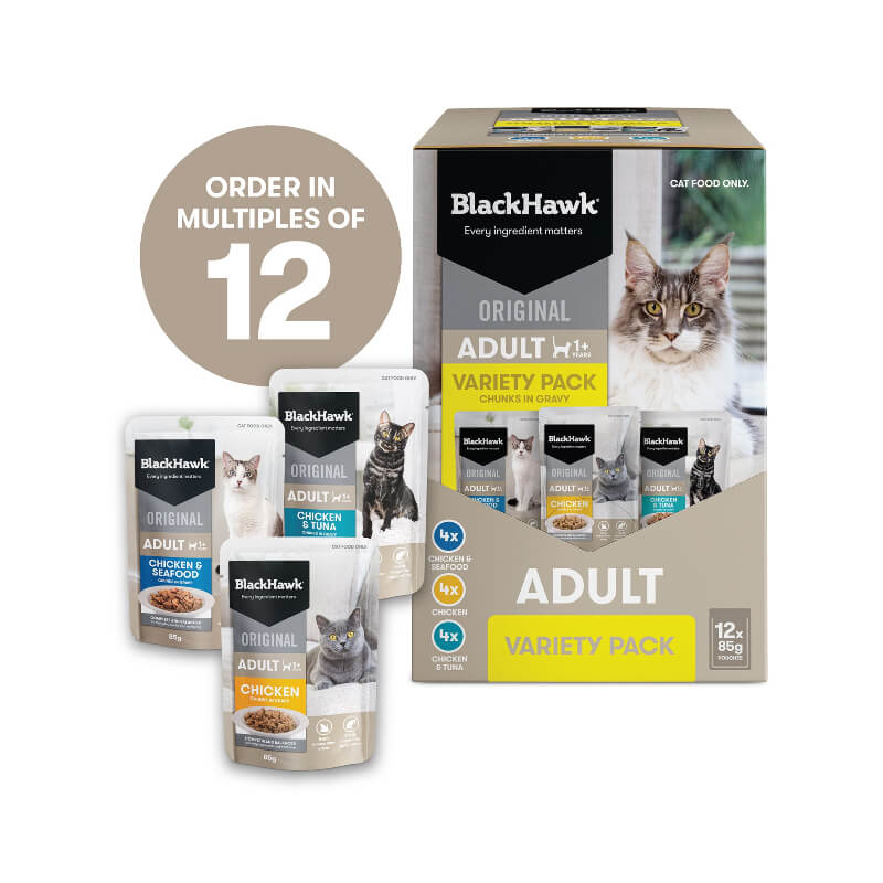 Give your cat more variety at mealtime with the Black Hawk Variety Pack Gravy Adult Wet Cat Food 85g x 12. Packed with real chicken, tuna and seafood, each pouch offers high-quality protein and rich flavour to satisfy even the fussiest cats. With three different recipes in one convenient box, this wet cat food supports hydration, lean muscle, and everyday vitality for adult cats 1+ years.