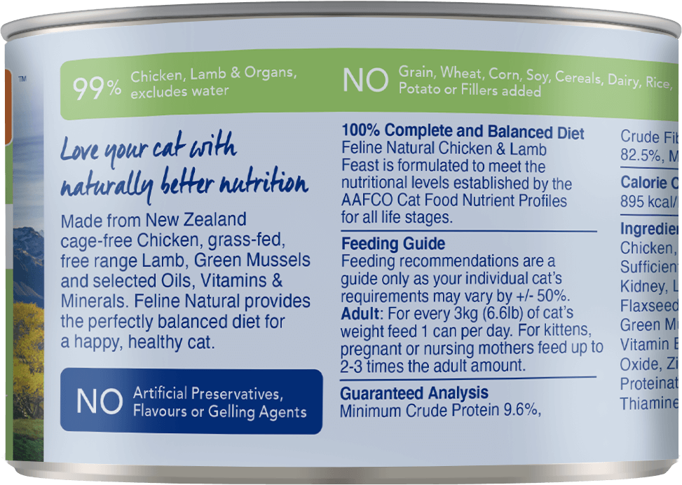 Feline Natural Cat Chicken and lamb wet cat food is made with selected whole-food New Zealand ingredients, vitamins, and minerals. A blend of free-range chicken and lamb, organs provides a rich flavour and is highly palatable, with added New Zealand fresh water for added hydration. This wet cat food is a complete and balanced diet with high palatable that your cats will love.