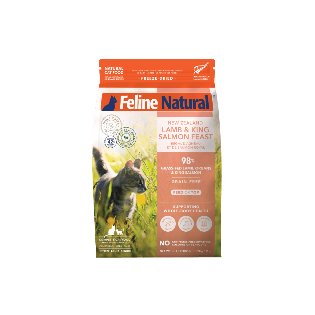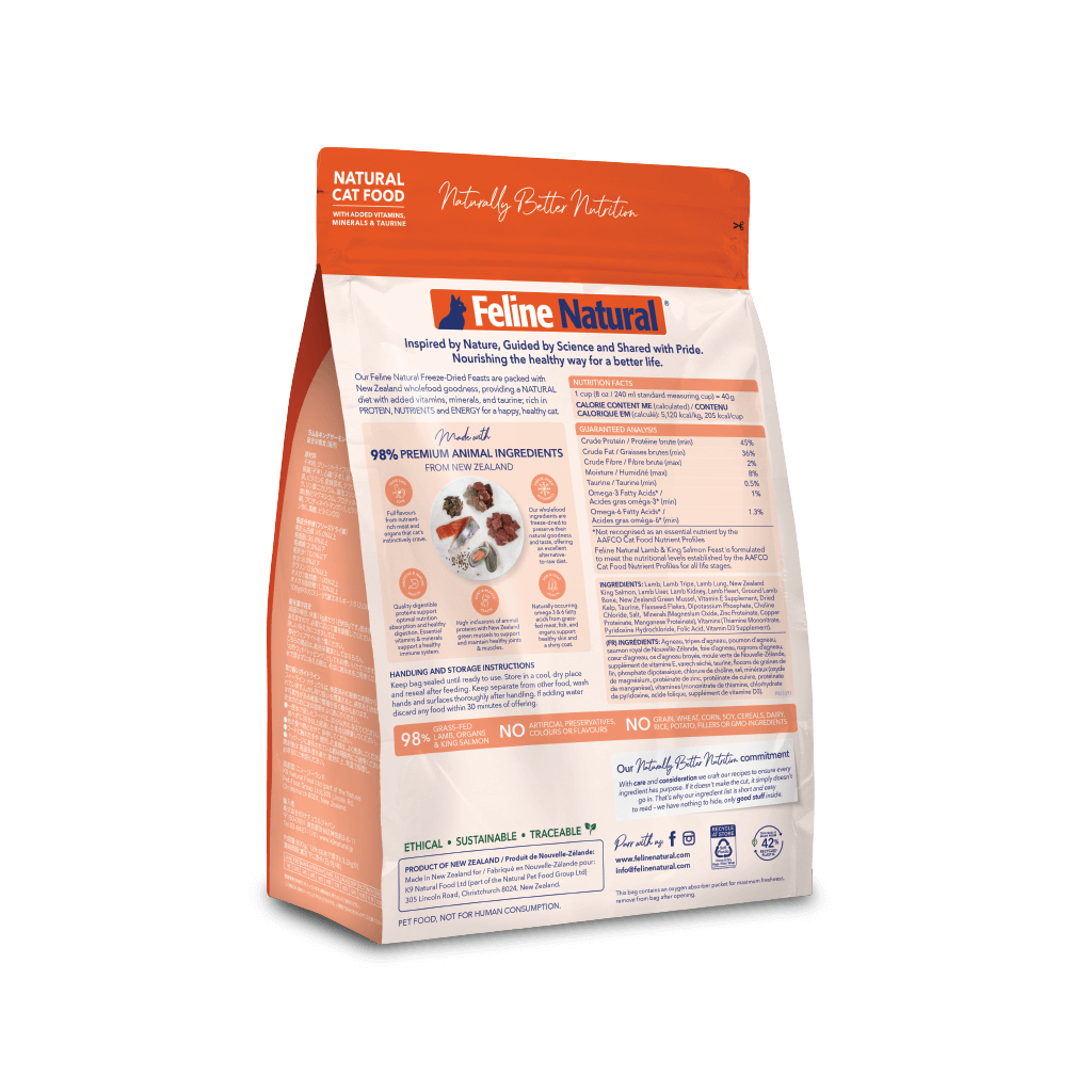 Feline Natural lamb & salmon Freeze Dried cat food is crafted with grass-fed, free-range lamb and sustainably caught salmon. The combination of lamb and king salmon gives your cats a delicious taste. The freeze-dried technology locks in the nutrition and flavour of lamb and salmon. This freeze-dried cat food contains a natural source of omega fatty acids from salmon to maintain healthy skin and coat. 99% lamb, salmon, and organs match the cat's biological needs for a rich meat diet.