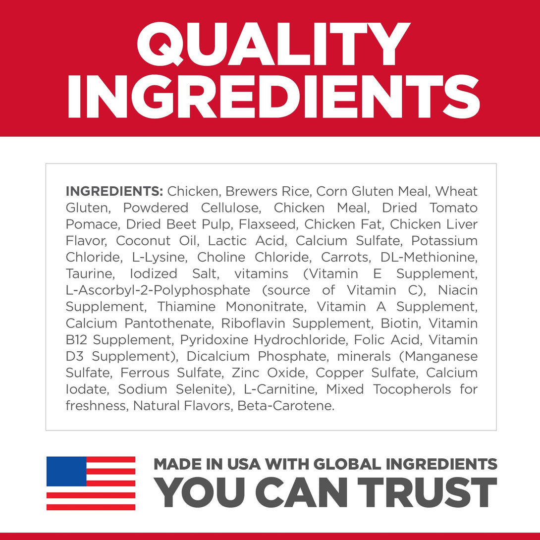 Chicken, Brewers Rice, Corn Protein Meal, Wheat Gluten, Oat Fiber, Chicken Meal, Dried Tomato Pomace, Dried Beet Pulp, Flaxseed, Chicken Fat, Chicken Liver Flavor, Coconut Oil, Lactic Acid, Calcium Sulfate, Potassium Chloride, L-Lysine, Choline Chloride, Carrots, DL-Methionine, Taurine, Iodized Salt, vitamins (Vitamin E Supplement, L-Ascorbyl-2-Polyphosphate [source of Vitamin C], Niacin Supplement, Thiamine Mononitrate, Vitamin A Supplement, Calcium Pantothenate, Riboflavin Supplement, Biotin, Vitamin B12 Supplement, Pyridoxine Hydrochloride, Folic Acid, Vitamin D3 Supplement), Dicalcium Phosphate, minerals (Manganese Sulfate, Ferrous Sulfate, Zinc Oxide, Copper Sulfate, Calcium Iodate, Sodium Selenite), L-Carnitine, Mixed Tocopherols for freshness, Natural Flavours, Beta-Carotene.