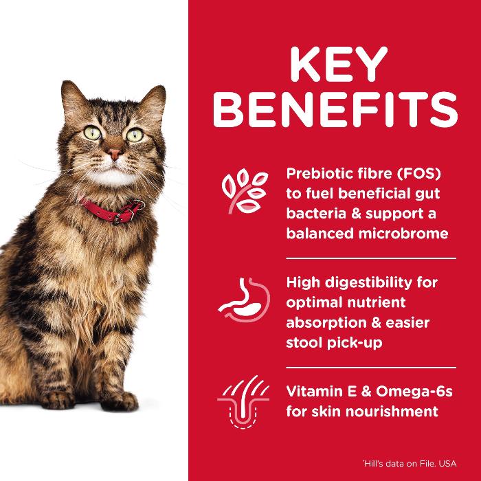 Hill’s Science Diet Adult Sensitive Stomach & Skin Dry Cat Food Chicken is crafted to support digestive balance and skin health in adult cats. Formulated with prebiotic fibre to fuel beneficial gut bacteria, this dry cat food promotes gentle digestion, better nutrient absorption, and firmer stools — all while keeping your cat’s skin nourished and their coat soft and shiny.