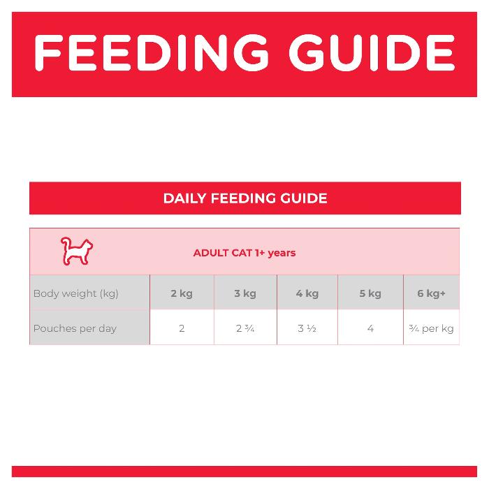 These amounts are a starting point only. Adjust portions as needed to maintain optimal weight. When introducing this food for the first time, mix gradually with your cat’s previous food over 7 days. Always provide fresh water.