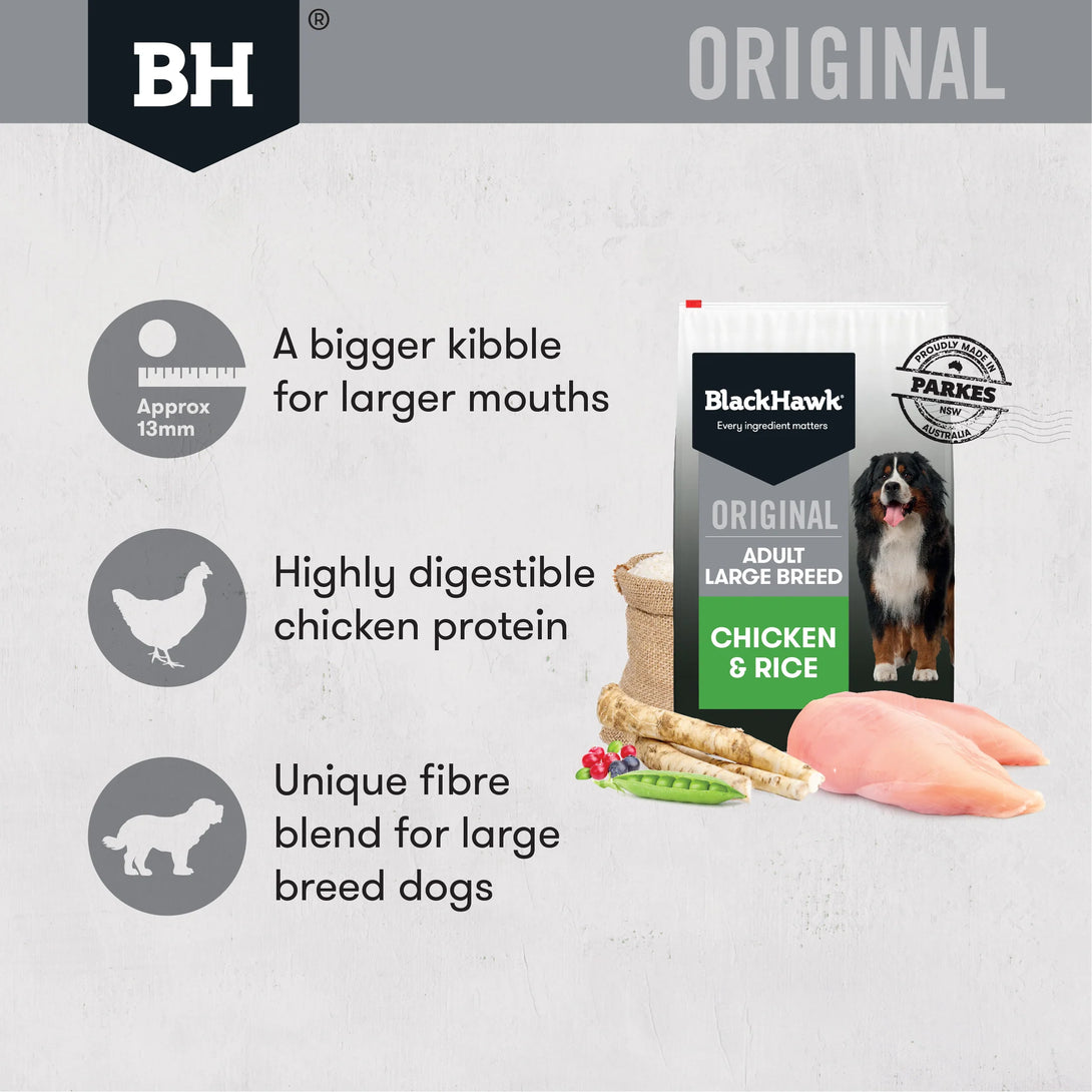 Black Hawk Original Large Breed Dry Dog Food Chicken & Rice 20kg is specifically formulated to meet the unique nutritional needs of large and giant breed adult dogs. This premium dry dog food is proudly made in Australian with real chicken as the first ingreidents, delivering a high-quality source of protein to support lean muscle development and overall vitality.