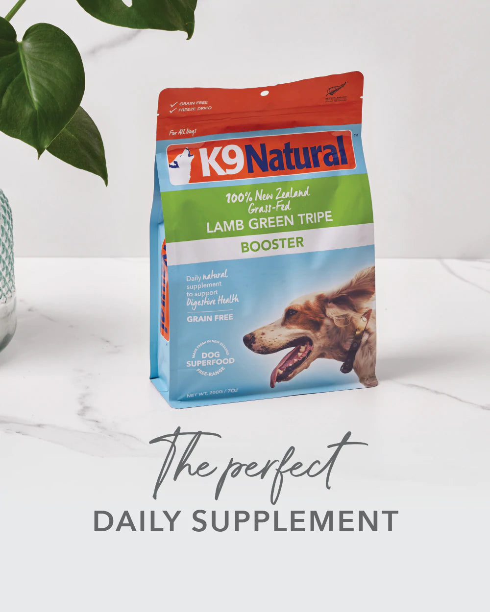 Hailed as a highly palatable, natural superfood, Green Tripe is a fantastic supplement containing an abundance of vital nutrients for your dog. Sourcing only the highest quality New Zealand grass-fed, free-range Lamb Tripe, our K9 Natural Freeze-Dried Boosters aid digestion, skin, coat, and immune function. We highly recommend the use of this superfood to aid in transitioning your dog to a new diet.