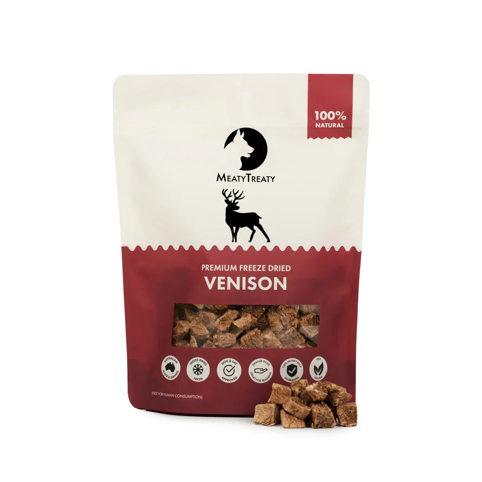 MEATY TREATY Freeze Dried Venison Dogs & Cats Treat 70G A great lean protein source for pets with specific dietary needs, venison is a suitable hypoallergic option instead of common proteins. Lower in fat compared to other meats, and rich in iron, zinc, and B vitamins.