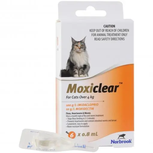 Moxiclear is a monthly, water-resistant, spot-on treatment designed for cats weighing over 4kg. It effectively prevents and controls a broad spectrum of parasites. Its fast-acting formula targets fleas, heartworms, and intestinal worms, ensuring comprehensive protection for your dogs.