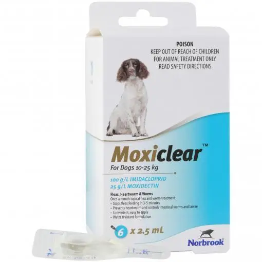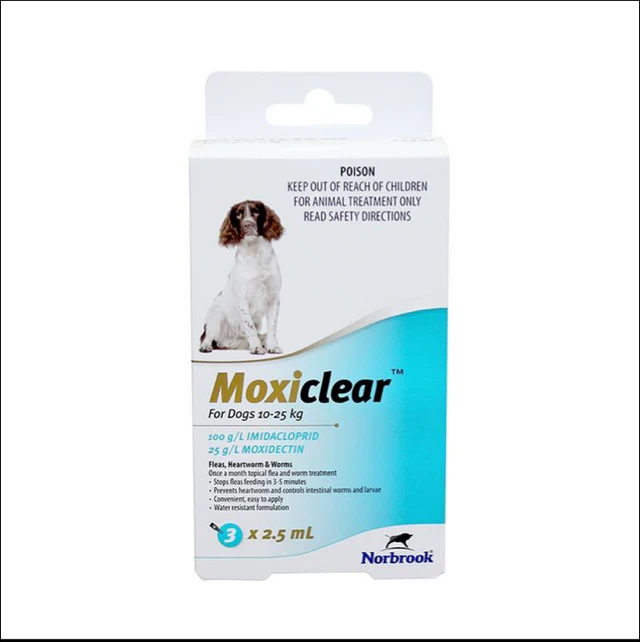 Moxiclear is a monthly, water-resistant, spot-on treatment designed for dogs weighing 10kg to 25kg. It effectively prevents and controls a broad spectrum of parasites. Its fast-acting formula targets fleas, heartworms, and intestinal worms, ensuring comprehensive protection for your dogs.