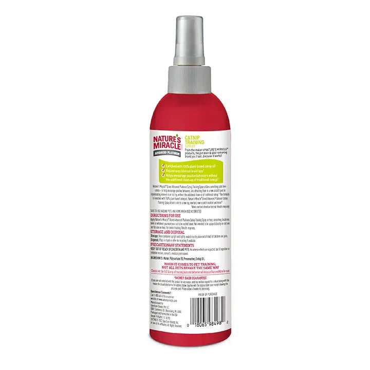 Spray Nature's Miracle Brand Advanced Platinum Catnip Training Spray on toys, scratching locations, beds, or whatever you want your cat to be excited about. Not intended to be sprayed directly on cat and not for use on food. For indoor training. Results may vary.
