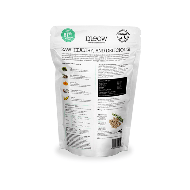 Meow Freeze Dried Cat Food Lamb & King Salmon is made by highest quality ingredients from New Zealand. This freeze-dried cat food is made with real lamb, providing a protein-rich diet that cats naturally crave. This complete and balanced diet is formulated to meet the nutritional needs of your cats, including essential vitamins, minerals, and amino acids. The freeze drying process lock in the nutrition and taste of fresh. This complete and balanced raw food contains 90% grass-fed, free-range lamb, organs and bones plus superfood.
