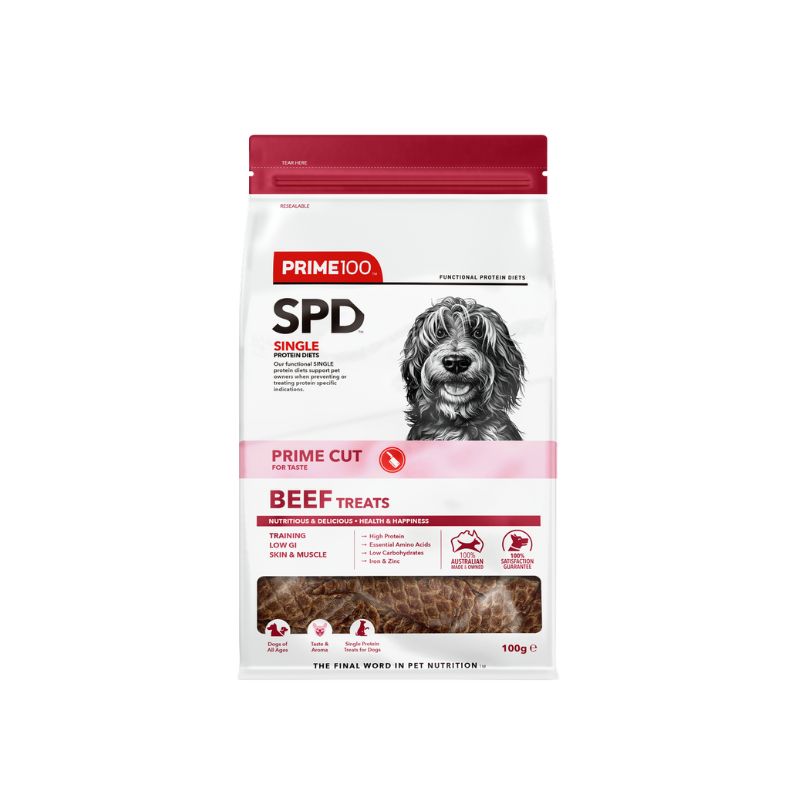 Prime100 SPD™ Prime Cut Beef Treats are premium, Australian-made single-protein treats crafted with the same care and quality as the entire Prime100 Functional Protein Diet range. Made from real Australian beef and enriched with honey and apple fibre, these grain-free, gluten-free, and soy-free dog treats are delicious, healthy, and suitable for all breeds and life stages.