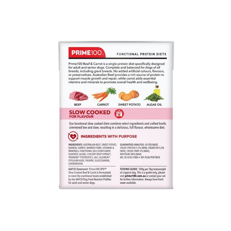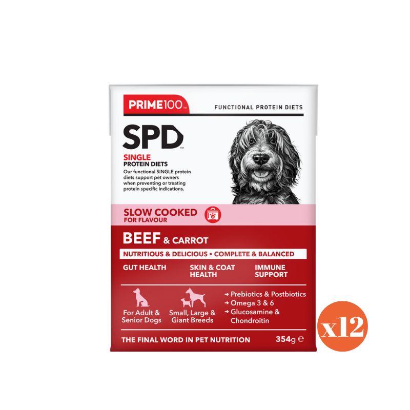 Prime100 SPD Slow Cooked Beef & Carrot is a premium single-protein wet food designed to deliver superior daily nutrition for dogs with food sensitivities or sensitive digestion. Made with high-quality, human-grade Australian beef and nutrient-rich carrots, this grain-free recipe is highly digestible, flavoursome, and ideal for adult and senior dogs.