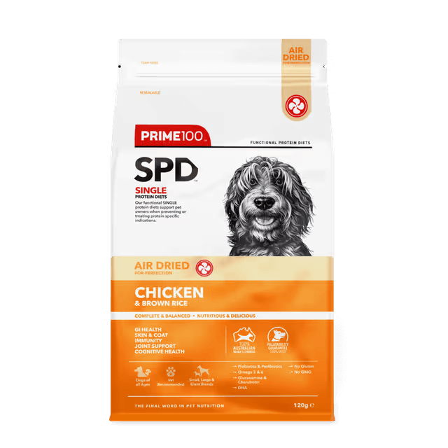 Prime100 SPD Air Dried Chicken & Brown Rice is a premium, grain-friendly, single-protein diet made in Australia for dogs with sensitive stomachs, mild intolerances, or specific dietary needs. It combines 100% Australian chicken — a lean, highly digestible protein — with nutrient-rich brown rice for gentle fibre and sustained energy.