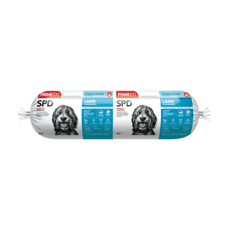 Prime100 SPD Lamb & Rosemary is a nourishing single-protein dog food roll designed especially for energetic dogs and growing puppies. Featuring Australian lamb as the only animal protein source, this natural Prime100 dog food delivers complete, balanced nutrition to support vitality, healthy growth, and skin integrity across all breeds and life stages—including large and giant breeds.