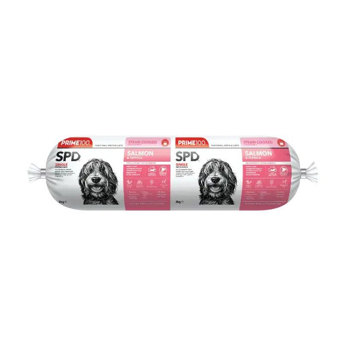 Prime100 SPD™ Salmon & Tapioca is a premium single-protein, hypoallergenic fresh dog roll made with 100% Australian salmon. This novel protein recipe is designed for dogs with suspected food sensitivities, skin allergies, or digestive issues, delivering gentle, highly digestible nutrition in a complete and balanced format.