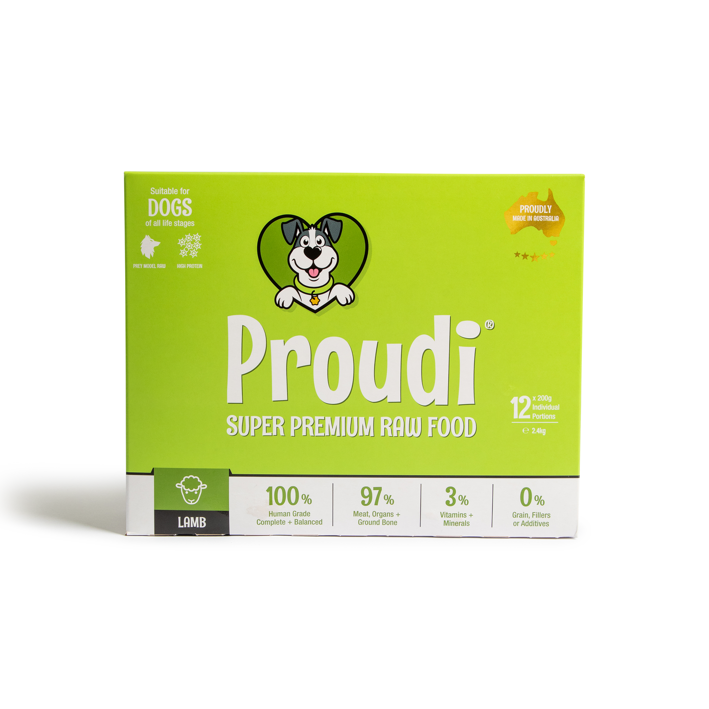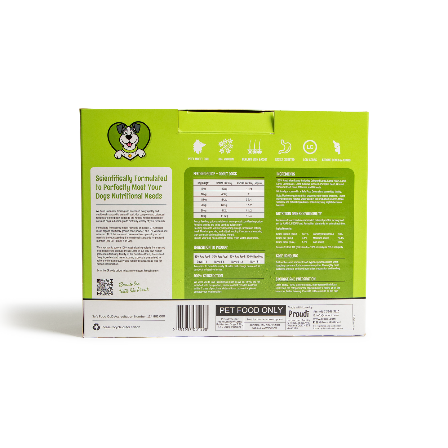 Proudi Lamb recipe offers 100% human-grade ingredients: 95% lamb meat, offal, moisture, powdered bone, and 5% essential vitamins and minerals. Free from artificial additives, grains, and preservatives, it suits dogs with dietary intolerances, providing a wholesome, single-protein raw diet.