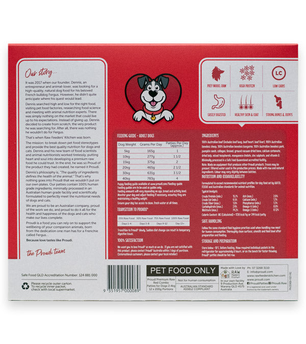 Proudi Red Combo recipe is a mix protein raw food made with 100% human grade ingredients, including 95% sheep, kangaroo and pork meat, beef offal, moisture and powdered bone, with 5% vitamins and minerals. It is free from artificial additives, fillers, grains, and preservatives that are commonly found in commercial pet foods. Proudi raw dog food red combo is a great option for fussy eaters, or dogs with white meat intolerances who still love variety.