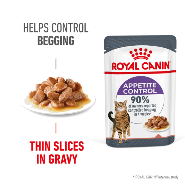 Royal Canin's Appetite Control Gravy Wet Cat Food features a unique blend of fibers that satisfy your cat's appetite between meals, reducing begging behavior and helping them feel full and content. Over 90% of owners noticed a reduction in begging behavior within 4 weeks when feeding this formula alongside Royal Canin dry food.*