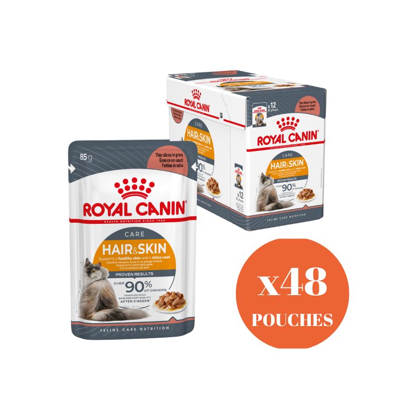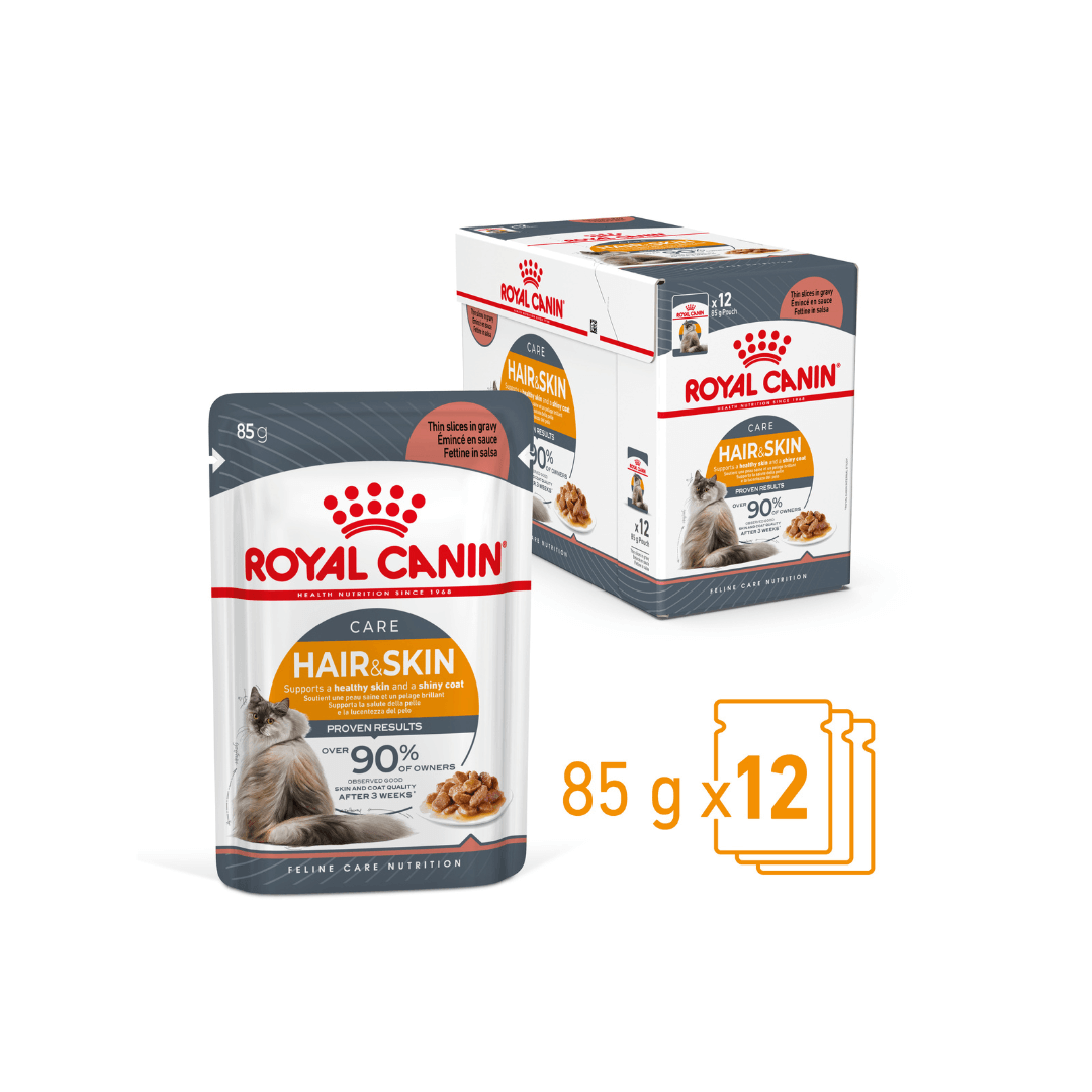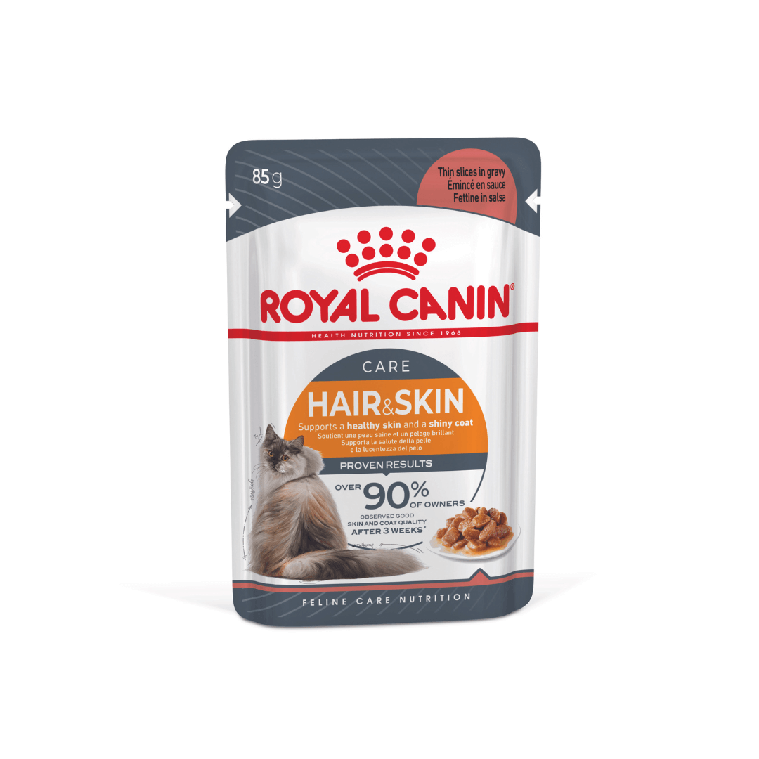 Royal Canin Hair & Skin Care Gravy Wet Cat Food is specially crafted to support healthy skin and a shiny coat for adult cats. With a delicious gravy texture that cats love, this wet cat food combines targeted nutrition with an irresistible taste, making it an easy choice for daily feeding.