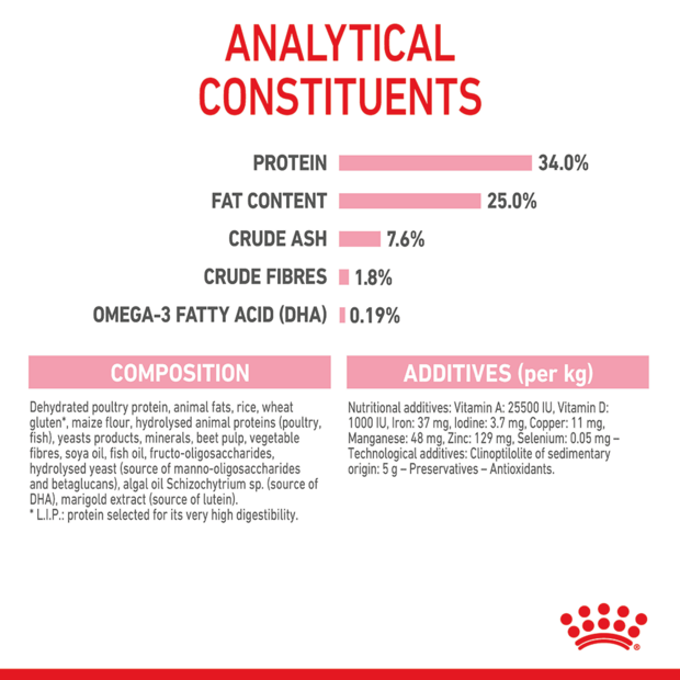 Main Ingredients: Dehydrated poultry protein, rice, animal fats, maize flour, yeasts, beet pulp, soya oil, fish oil, prebiotics, hydrolysed animal proteins, algal oil (DHA), marigold extract (lutein).