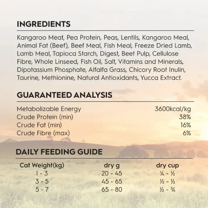 Kangaroo Meat, Pea Protein, Peas, Lentils, Kangaroo Meal, Animal Fat (Beef), Beef Meal, Fish Meal, Freeze Dried Lamb, Lamb Meal, Tapioca Starch, Digest, Beet Pulp, Cellulose Fibre, Whole Linseed, Fish Oil, Salt, Vitamins and Minerals, Dipotassium Phosphate, Alfalfa Grass, Chicory Root Inulin, Taurine, Methionine, Natural Antioxidants, Yucca Extract.