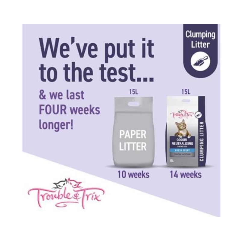 Keep your home fresh and your litter box hassle-free with Trouble & Trix Baking Soda Clumping Cat Litter Lavender. Perfect for local shoppers, this 15L pack offers great value for in-store customers looking for high-performance, odour-neutralising cat litter.