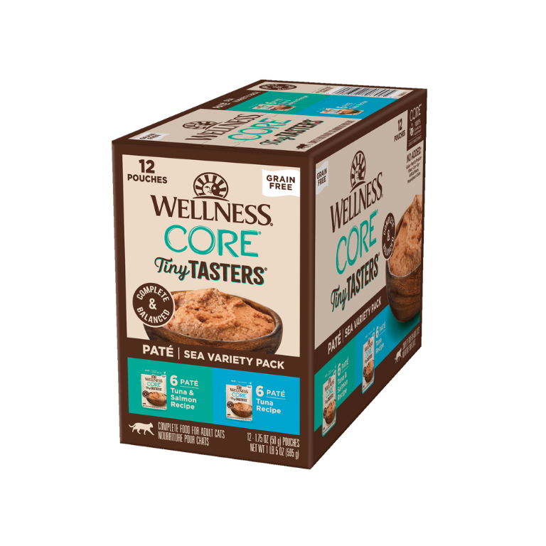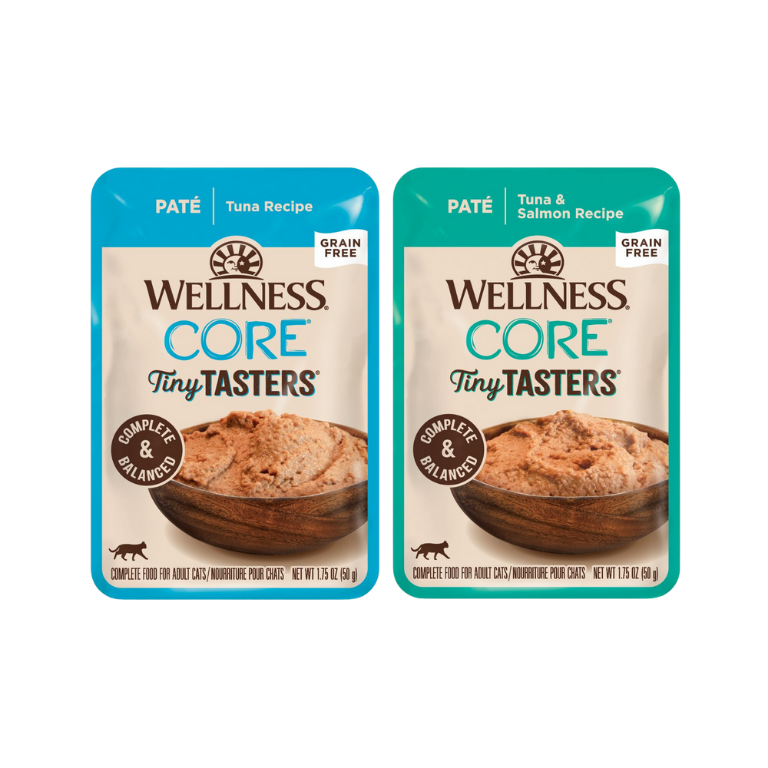 Wellness CORE is based on the nutritional philosophy that cats, given their primal ancestry, thrive on a diet mainly comprised of meat. With the smooth pate texture cats’ love and the protein-packed flavour they crave, this CORE Tiny Tasters Variety Pack of delicious recipes is sure to be a hit with even the finickiest of felines! Crafted with real tuna first and salmon for the high-quality protein your cat needs to fuel her day along with moisture from wet food to support healthy daily hydration. Each recipe is in an easy-to-squeeze, single-serve pouch to make mealtime quick and easy —no can openers or spoons needed here! This variety pack comes with 12 grain-free pate recipes that are each complete and balanced meals—6 packets of Tuna & Salmon Pate and 6 packets of Tuna Pate.