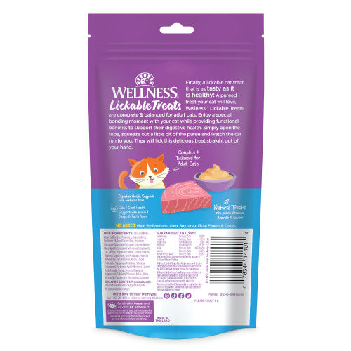 Wellness Lickable Treats for cats are as tasty as they are healthy. A pureed treat your cat will love, these handheld treats are complete & balanced for adult cats and help support digestive & immune health. Simply open the tube, squeeze out a little bit of the puree and watch your cat run to you!