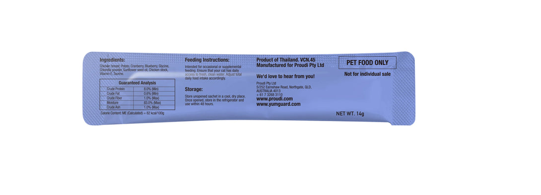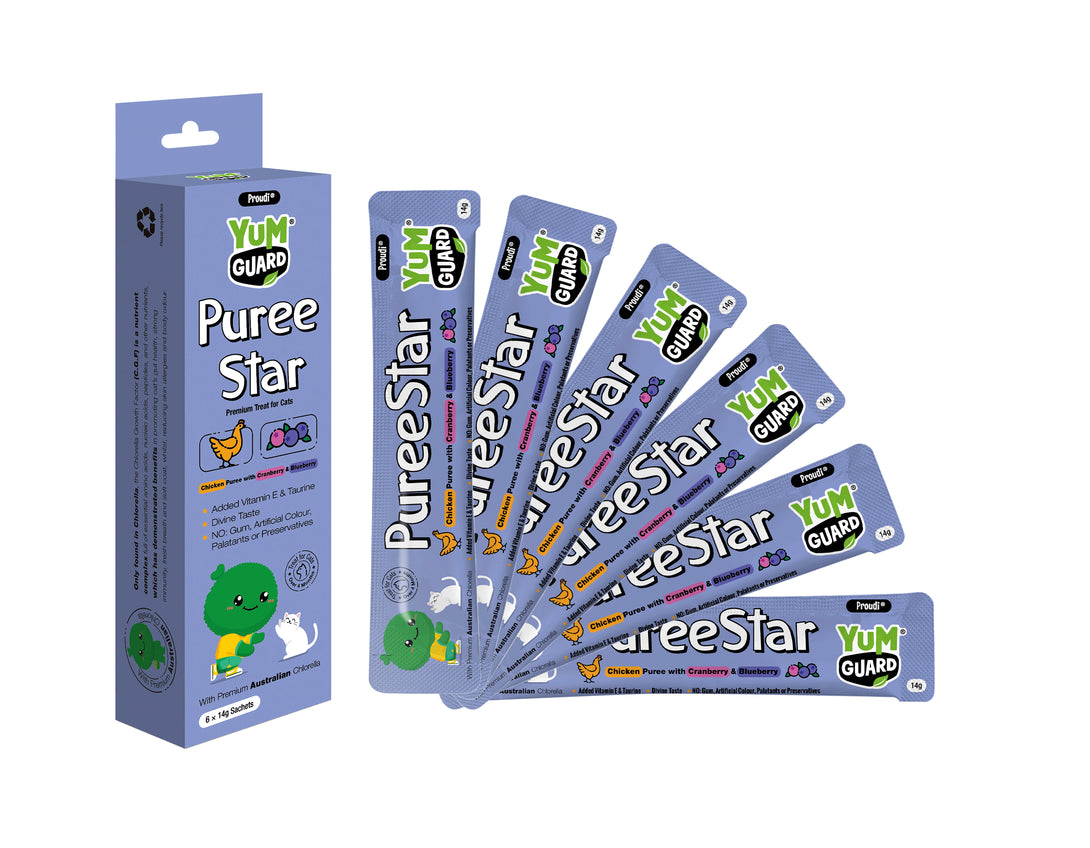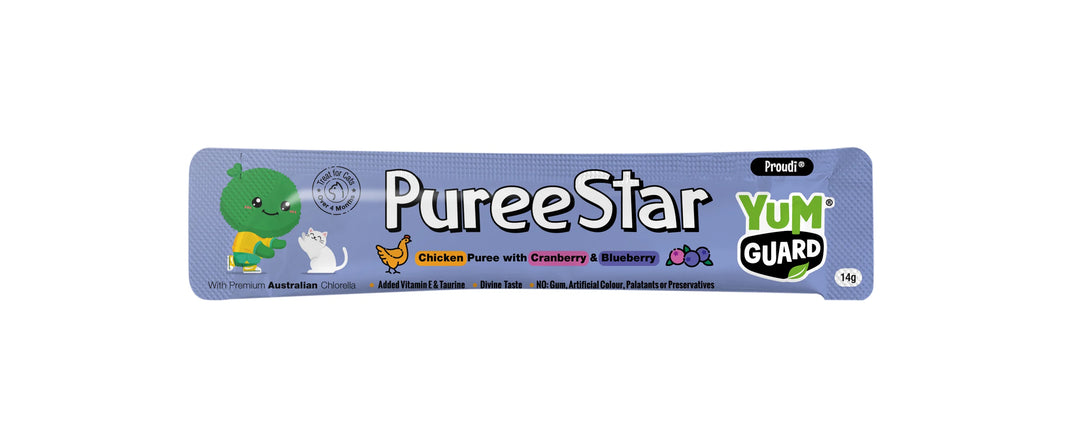 Give your cat a treat they'll love with YumGuard's Puree Star Chicken with Cranberry - a nutritious snack packed with essential vitamins and minerals, including the renowned Chlorella growth factor for healthy tissue growth and repair. With its smooth texture and irresistible flavour, your feline friend won't be able to resist this tasty treat.