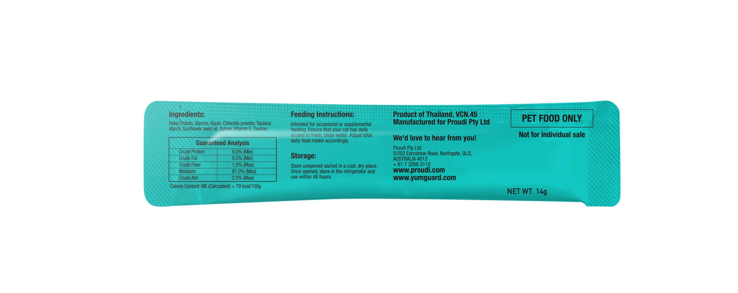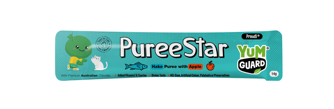 Indulge your cat with YumGuard's Puree Star Hake with Apple - a delicious and nutritious snack rich in essential vitamins and minerals, including the renowned Chlorella growth factor for healthy tissue growth and repair. With its smooth texture and rich flavour, your feline friend will enjoy every bite.