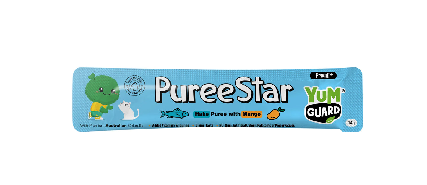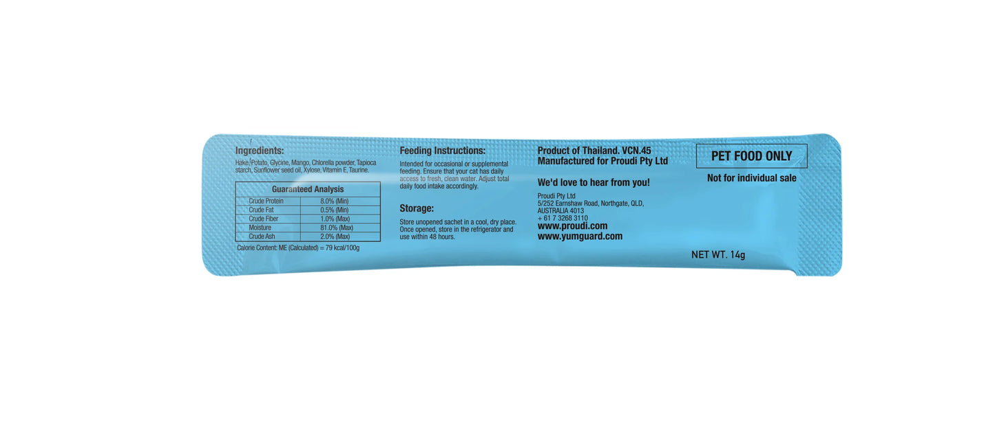 Give your cat a treat they'll love with YumGuard's Puree Star Hake Puree with Mango - a nutritious snack packed with essential vitamins and minerals, including the renowned chlorella growth factor for healthy tissue growth and repair. With its smooth texture and irresistible flavour, your feline friend won't be able to resist this tasty treat.